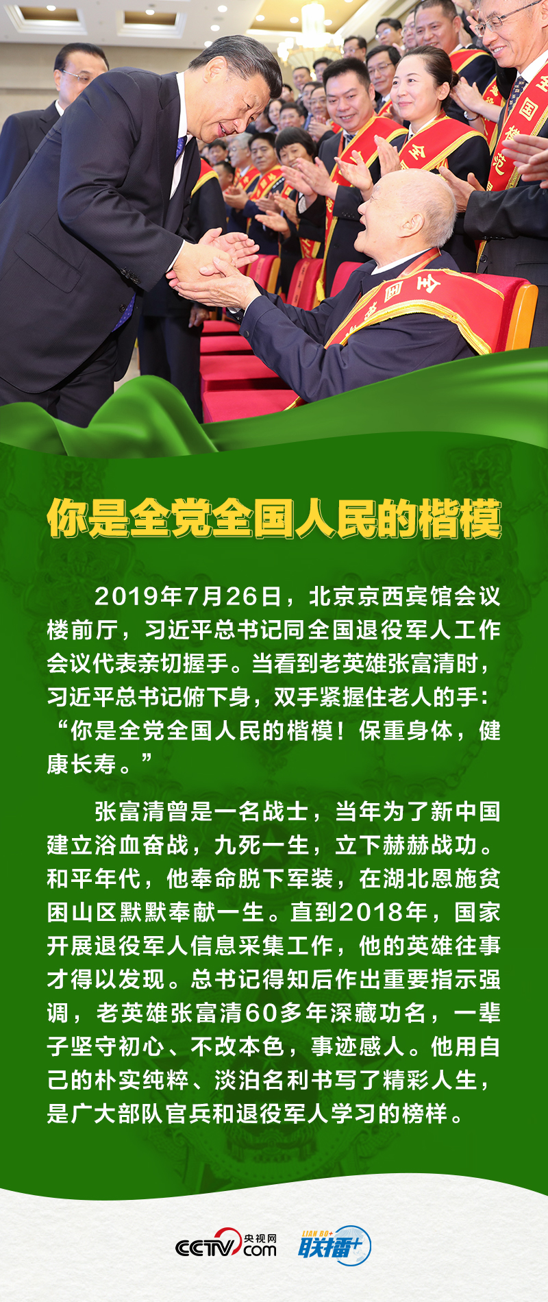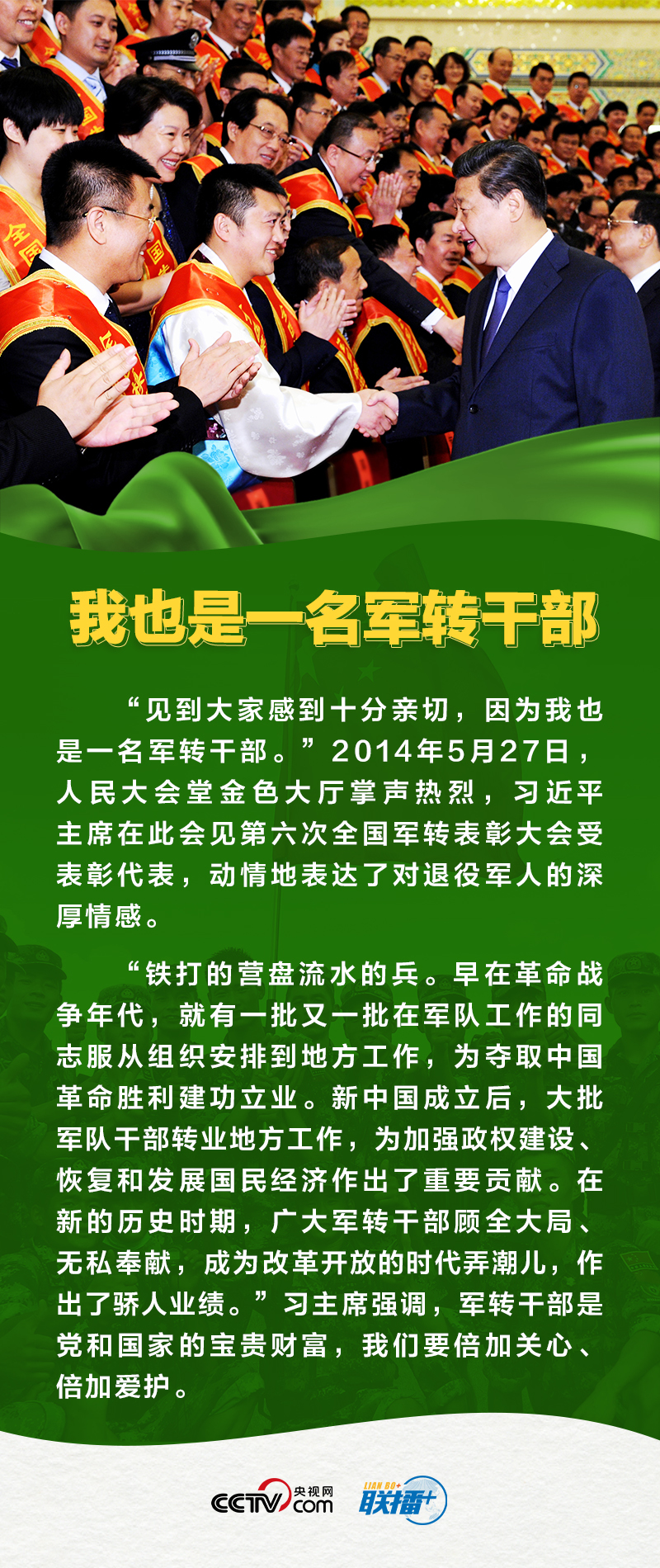 退役与现役是军人人生的不同阶段,无论是穿着军装为国家保驾护航,还是脱下军装为梦想打拼,都值得全社会尊崇!央视网《联播+》特推出海报,为您讲述习主席与退役军人之间的温暖故事。